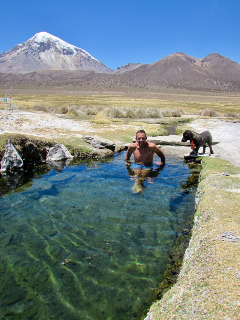 La longue descente vers le village (17km) croise heureusement la route d’un bassin naturel rempli d’eau thermale à 39°c🥵