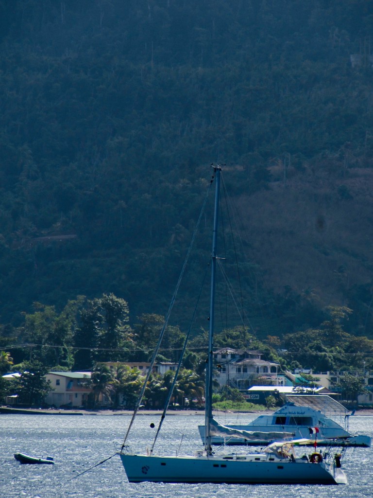 Nomad fait un arrêt météo au Nord de la verte et montagneuse Dominica, le temps de laisser passer un avis de grand frais, histoire de ne pas se faire trop secouer dans le canal. Nommée Dominica, car Christophe Colomb l’a juste contournée un dimanche, sans s’y arrêter, en 1493, elle semblait impénétrable. Les guerriers Caraïbes, féroces et indépendants, ont longtemps harcelé efficacement leurs adversaires, à tel point qu’en 1748, anglais et français, découragés, la déclarèrent « Île neutre appartenant aux Caraïbes ».