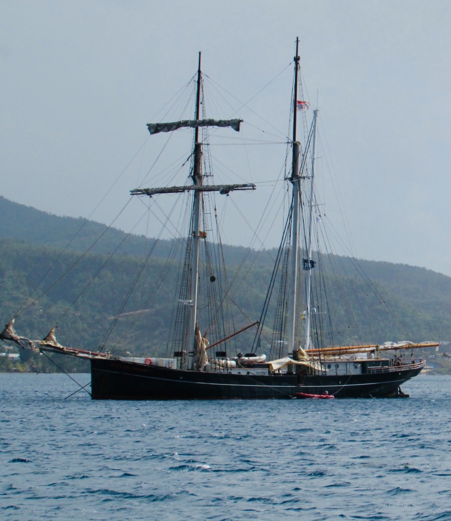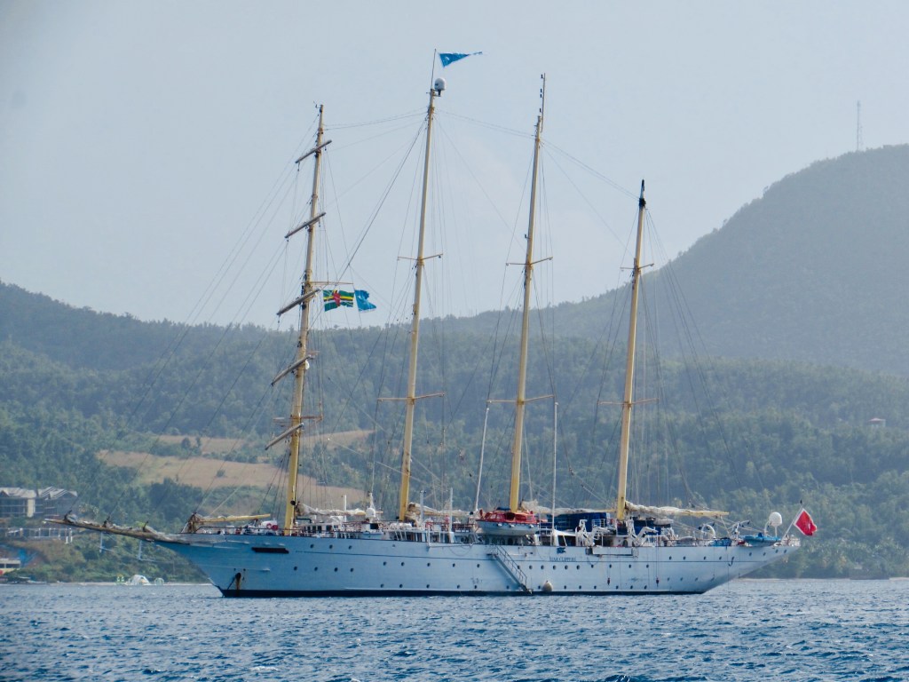 Mettons à profit ces quelques jours: ménage à bord, lessive à l’eau de pluie, visite de l’Indian River et du Fort Shirley à Portsmouth, entouré que nous sommes par des paquebots de croisière à voile et des mégas yachts dans la Prince Rupert Bay.